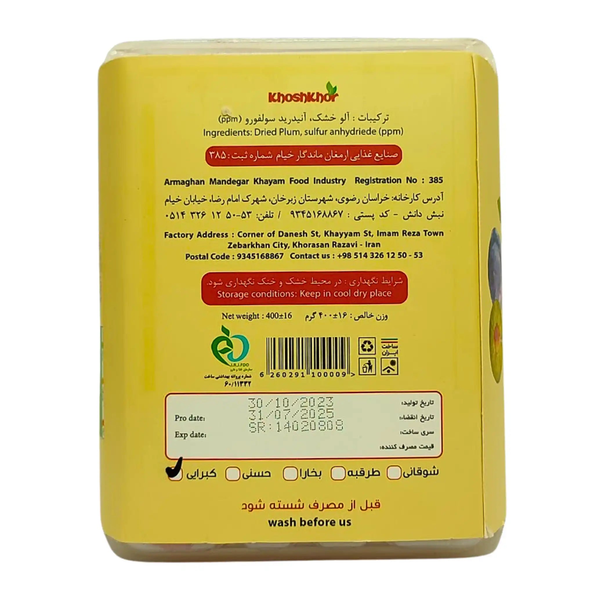 Torkade plommon 400g med iranskt ursprung är en delikatess som berikar olika traditionella maträtter i Iran. Denna uppskattade torkade frukt bär på en rik smak och saftighet som kompletterar både söta och salta rätter. Med ursprung i Iran garanterar dessa torkade plommon en autentisk smakupplevelse och lägger till en distinkt touch i din kulinariska repertoar.