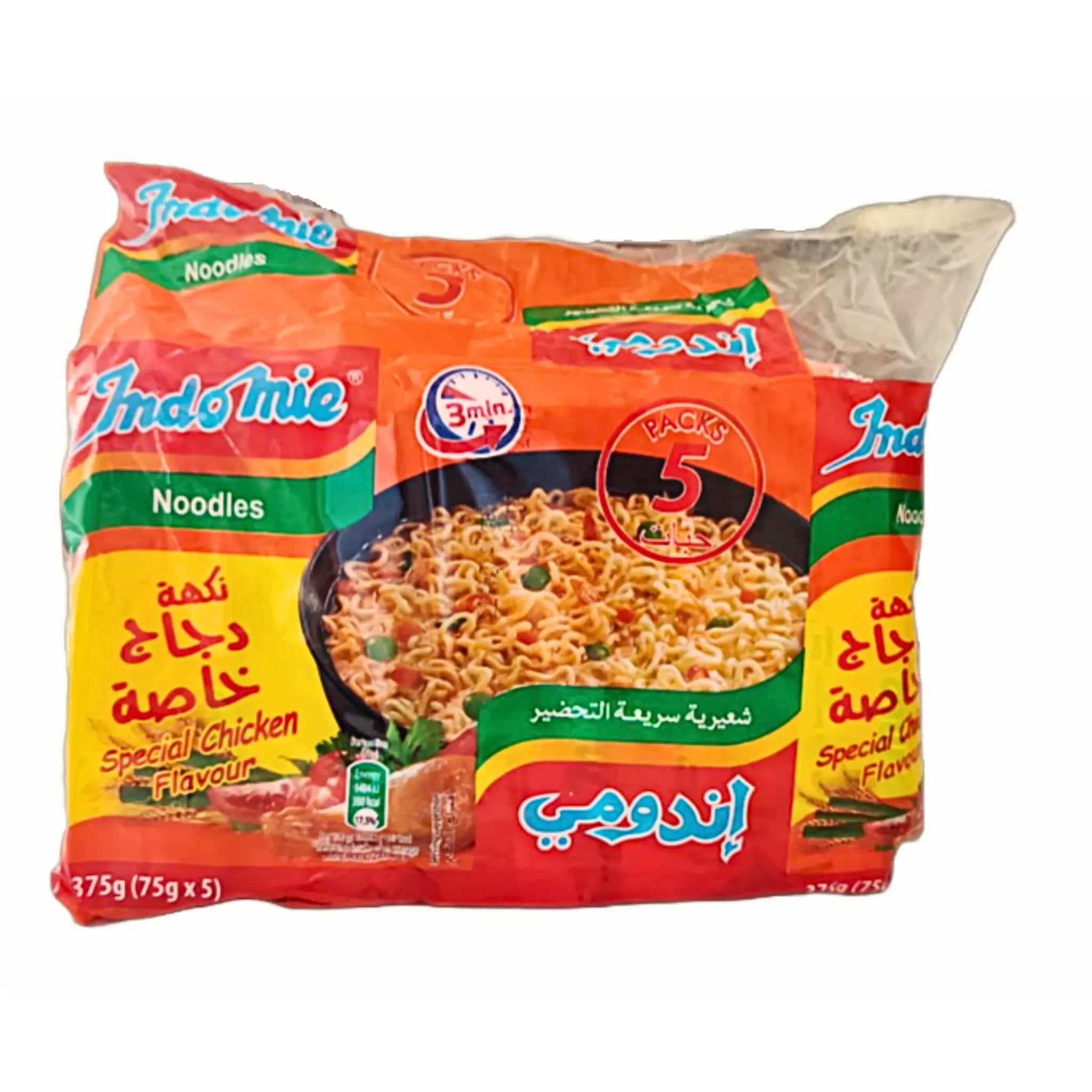 Nudlar Kyckling Special Indomie på 75g är en instant nudelprodukt som är tillverkad av mjöl, vatten och tillsatt kycklingbuljong. Det som särskiljer denna produkt från andra nudlar är den extra kryddiga smaksättning som har tillsatts i kycklingbuljongen.